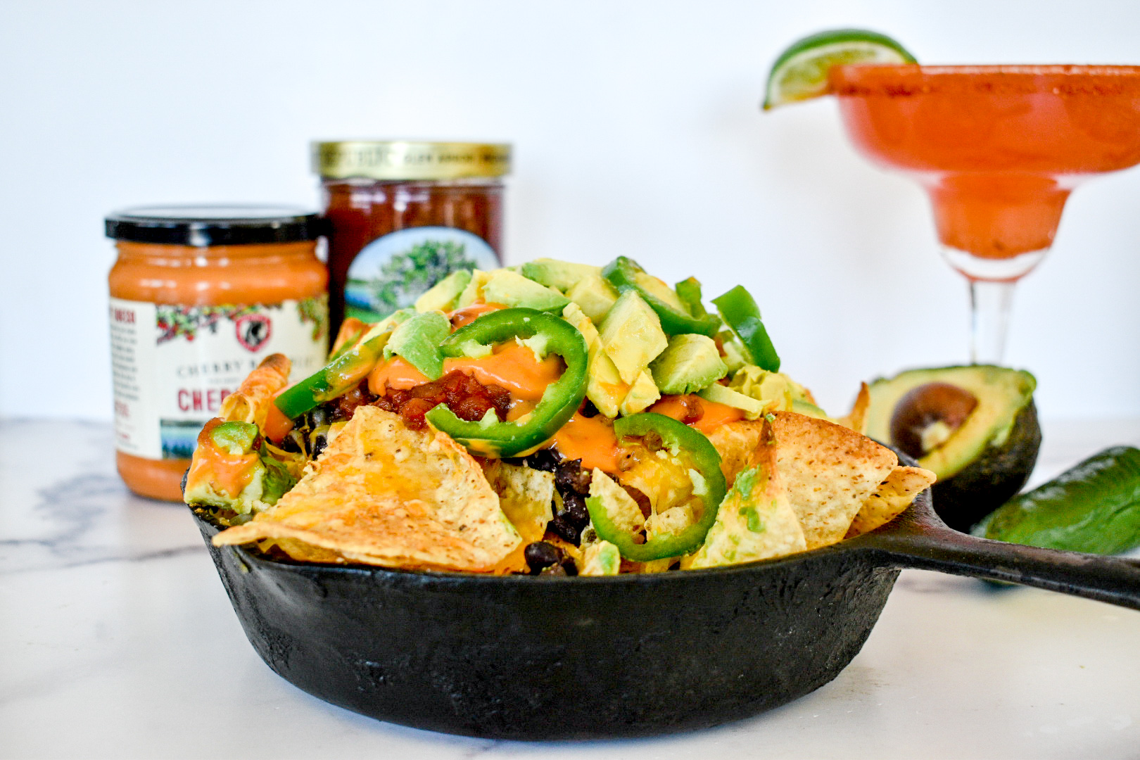 Cherry Skillet Nachos are easy, ready in 15 minutes, and loaded with black beans, avocado, jalapeno, Cherry Salsa, and lots of Cherry Queso! Perfect for Cinco de Mayo, game days, or a week night dinner.