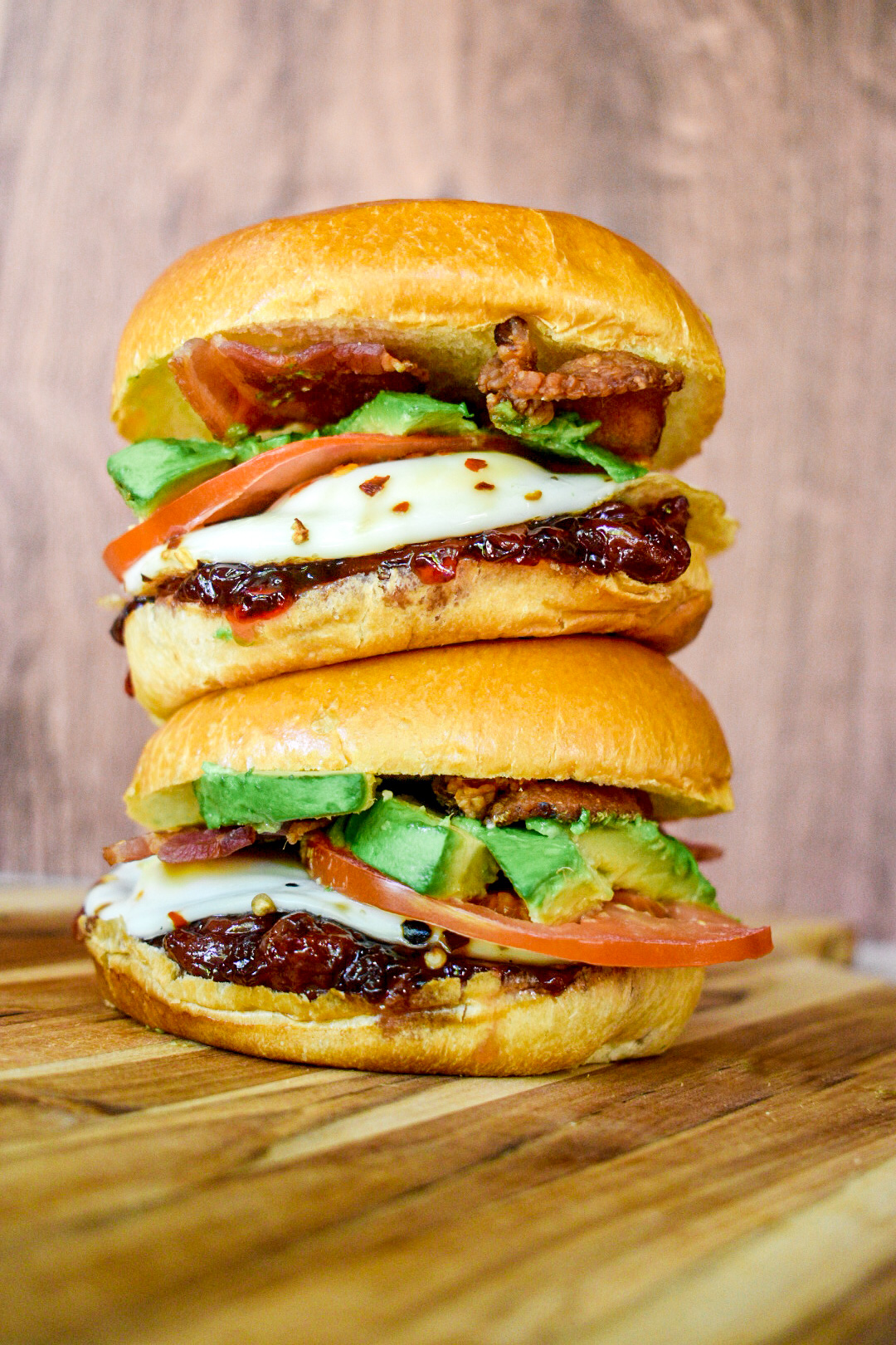 Our Savory Cherry Breakfast Sandwich is made with with a pan fried egg, bacon, fresh avocado, sliced tomato, Cherry Pepper Jelly, all on a Brioche Bun. Kind of spicy, kind of buttery, kind of crunchy, totally over the top.