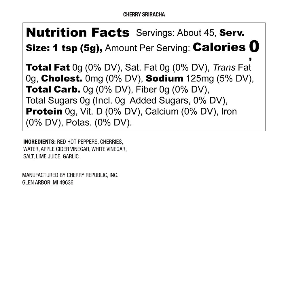 Inspired by the classic Thai hot sauce, Cherry Sriracha adds the World's greatest stone fruit to this global favorite chili-based sauce. Perfect for eggs, nachos with cherry salsa and long cold winters. Made in small batches in Michigan, of course!